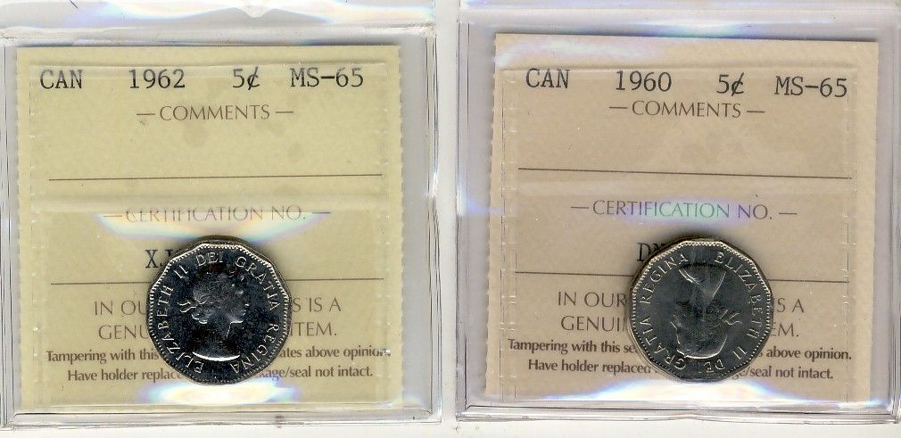 1960, 1962 5 Cents, ICCS MS65; Two coins.