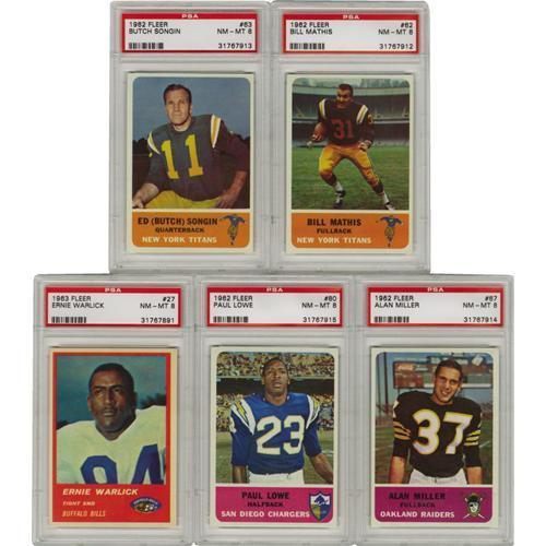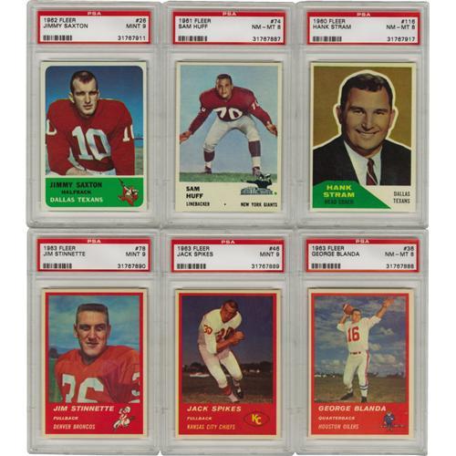 <B>1960-1963 Fleer Football Complete and Partial Sets Run.</B></I> Fleer's football card issues from the early 1960's offer a glimpse of the newly-formed American Football League, which would later merge with the National Football League; ushering in the modern era of professional American football. The 1961 effort is the only of the four set to include players from both leagues. A total of eleven cards have been graded by PSA with an aggregate SMR value of $596. Graded cards - 1960 <B>PSA NM-MT 8:</B></I> #116 Stram; 1961 <B>PSA NM-MT 8:</B></I> #74 Huff; 1962 <B>PSA MT 9:</B></I> #26 Saxton, <B>PSA NM-MT 8:</B></I> #62 Mathis, 63 Songin, 67 Miller, 80 Lowe; 1963 <B>PSA MT 9:</B></I> #46 Spikes, 78 Stinnette, <B>PSA NM-MT 8:</B></I> #27 Warlick, 36 Blanda. Ungraded cards from the 1960 set include #1 White (VG/EX), 20 Baugh (NM), 24 Atkins (NM), 58 Blanda (VG/EX), 118 Mix (EX/MT), 124 Kemp (VG). 5% NM to NM/MT, 24% EX to EX/MT, 64% VG to VG/EX and 7% FR to GD. <BR><BR> Ungraded cards from the 1961 set include #11 Brown (EX), 30 Unitas (VG), 35 Parker (NM), 41 Meredith (EX), 88 Starr (EX/MT), 96 Ringo (NM), 117 Layne (EX/MT), 155 Kemp (VG), 166 Blanda (EX), 197 Otto (miscut), 215 Maynard (EX). Grades 16% NM to NM/MT, 51% EX to EX/MT and 33% VG to VG/EX. Ungraded cards from the 1962 set include #46 Blanda (EX/MT), 59 Maynard (EX), 72 Otto (EX/MT), 79 Kemp (VG/EX). Grades 15% NM to NM/MT, 62% EX to EX/MT and 23% VG to VG/EX. Ungraded cards from the 1963 partial set - missing the following cards: #'23, 24 Kemp, 28, 32, 37, 47 Dawson, 48, 49, 50, 51, 56, 57, 58, 59, 60, 61, 62, 63, 65, 66, 70, 72, 79 - include #10 Buoniconti (EX/MT), 15 Maynard (EX/MT), Checklist (marked). Grades 22% NM to NM/MT, 65% EX to EX/MT and 13% VG to VG/EX (few lesser).<BR><BR><b>Shipping:</b> Trading Card Set, Medium (<a target="_blank" href="http://www.heritageauctions.com/common/shipping.php">view shipping information</a>)
