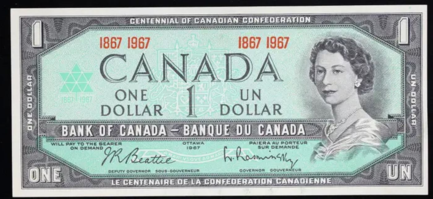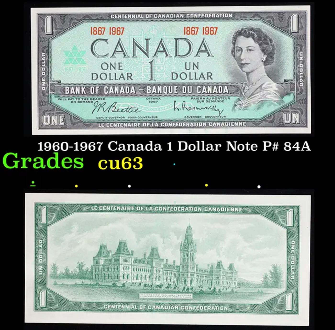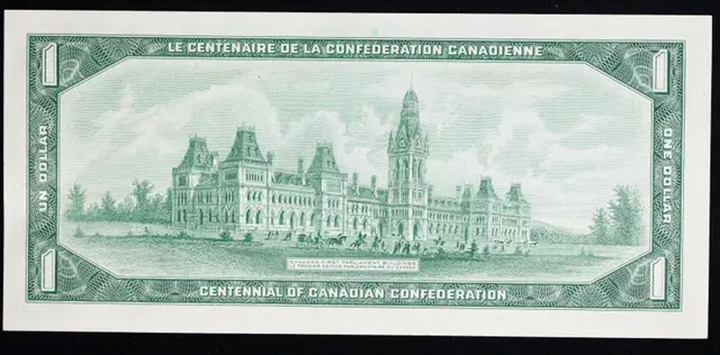 1960-1967 Canada 1 Dollar Note P# 84A Grades Select CU. In honour of the 100th anniversary of Confederation was the process by which three British North American provinces—the Province of Canada, Nova Scotia, and New Brunswick—were united into one federation called the Dominion of Canada , a modified version of the 1954 $1 note was issued, bearing the date 1967. The centennial logo was added to the front of the note and a view of Canada's original Parliament Buildings, destroyed by fire in 1916, was substituted for the prairie landscape that appeared on the original 1954 $1 note. A second version of this commemorative note, featuring the dates 1867–1967 in place of the serial numbers, was also issued.