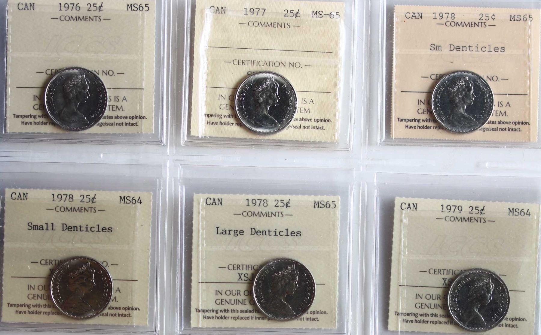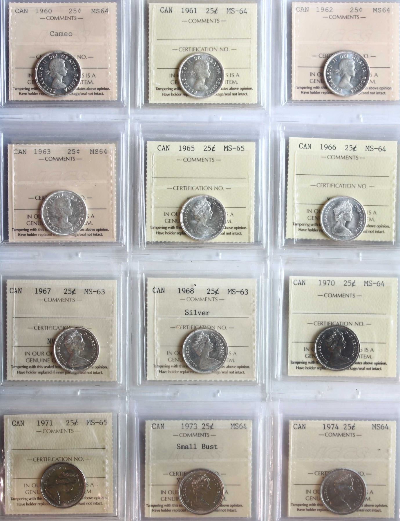 1960-1979 25¢ All 18 coins ICCS Choice Mint State-63 to Gem Mint State-65. Includes some interesting varieties.