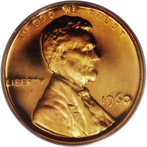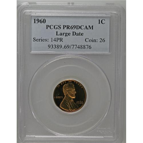 <B>1960<1C> Large Date PR69 Deep Cameo PCGS.</B></I> Two different date styles exist for the 1960 Lincoln cents, cataloged as the Small Date and Large Date varieties. These are easily distinguished by the relationship between the numerals 1 and 9. The tops of these digits are level on the Small Date variety, and the top of the 9 is higher than the 1 on the Large Date variety. This example is a blazing orange Gem with impressive surfaces and exquisite contrast.