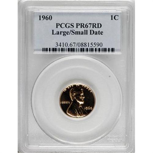 <B>1960 1C Large Over Small Date PR67 Red PCGS.</B></I> FS-025. Fivaz and Stanton rate this as "the more popular" of two proof Large Over Small Date varieties for the year, distinguished by the precisely concentric zeroes in the date. This gleaming Superb Gem offers bold detail and vivid, original copper-orange color. Population: 45 in 67 Red, 16 finer (6/07).<BR><BR><b>Shipping:</b> Coins & Currency (<a target="_blank" href="http://www.heritageauctions.com/common/shipping.php">view shipping information</a>)
