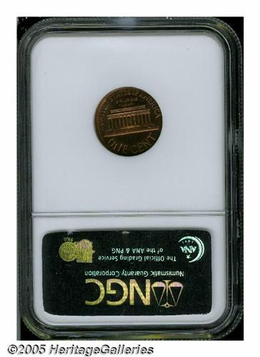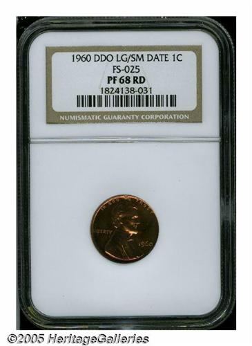 <B>1960<1C> Large Over Small Date PR68 Red NGC.</B></I> FS-25, DDO 1-O-III. The magnificent coppery-gold color shows splashes of crimson on the obverse. A seemingly perfect specimen with an unimprovable strike. LIBERTY and the date are die doubled, most strongly on the 0 in the date. Population: 11 in 68, 2 finer (3/05).