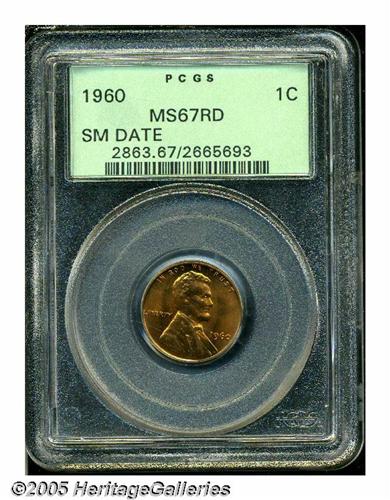 <B>1960<1C> Small Date MS67 Red PCGS.</B></I> Booming luster and radiant pumpkin-orange color provide exceptional eye appeal. A few minute carbon flecks and a tick on the reverse at 3 o'clock deny perfection. The 1960 Small Date is the scarcest among the four Small Date and Large Date Philadelphia and Denver Mint combinations of the year. Encapsulated in a green label holder. Population: 5 in 67, 0 finer (4/05).<BR><I>From The Western Hills Collection.</B></I>