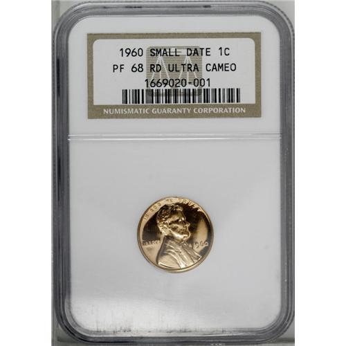 <B>1960<1C> Small Date PR68 Red Ultra Cameo NGC.</B></I> This is a razor-sharp peach-gold Superb Gem with good cameo contrast and essentially perfect surfaces. The Small Date variety, best identified by the shape of the 6, is the more difficult of the two logotypes of 1960 cents. <BR><BR><B>Important notice:</B> Heritage usually auctions material at the rate of 200-250 lots per hour. On some occasions eBay Live bid software or the Internet may not be able to keep up with the pace of the auction. We recommend placing a realistic absentee bid now as insurance to avoid disappointment. Occasionally the auctioneer may eliminate or reject an eBay Live bid, and the auctioneer may also reopen a lot after the close of the eBay live bidding (usually because we missed an audience bid), and may reject your bid even if it shows you as the winning bidder. By bidding via eBay Live, you agree that Heritage may award the lot to another bidder at its sole discretion under the circumstances described above or any other reasonable circumstances. Since eBay bids are not shown to us until we open the lot on the floor, we treat those bids just like floor bids. In most cases the floor responds before the eBay bid is presented to us, due to Internet lag time, so for consistency we have made it a policy that floor bids are always considered first over tie eBay live bids. Also please note that all Heritage lots purchased through eBay Live carry a 20% Buyer's Premium. Please make sure you read the Terms and Conditions before you bid. This lot is being auctioned in conjunction with a live floor auction by Heritage Galleries & Auctioneers. All final auction and invoice information will be supplied by Heritage Galleries & Auctioneers, and all other information should be considered preliminary. Lot:715 <BR><BR><B>Winning Notification and Billing:</B> After the FINAL session in this auction is complete, Heritage will send e-mail and snail mail invoices. This process normally takes several days. All final auction and invoice information will be supplied by Heritage Galleries & Auctioneers, and all other information should be considered preliminary. <BR><BR>This auction will be conducted on a live auction floor and over the Internet through eBay Live. If you choose to place an absentee bid, please take a moment to <font color='#0000ff'><u><a href='http://pages.ebay.com/liveauctions/help/before/laabsentee.html'>learn how eBay Live absentee bidding works</a></u></font><font color='#000000'>