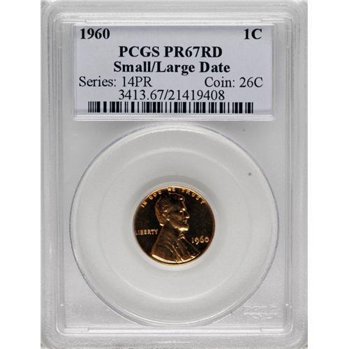 <B>1960 1C Small Over Large Date PR67 Red PCGS.</B></I> FS-024. At one time during the BU roll boom of the late 1950s and early 1960s, it seemingly mattered not what rolls one had: If one had rolls, one was in high cotton, and was poised to make a fistful of money. The speculative fervor was also aided by the launch of <I>Coin World,</B></I> a <I>weekly</B></I> publication dedicated to coin collecting that was first published in April 1960. There was at that time, at least for modern issues, no distinction between MS67 and MS60; either a coin was BU, or it wasn't. BU rolls of 1950-D nickels soared to more than $1,000 for a roll of 40 pieces before the market took a nosedive in 1965. At the height of the mania, a bank-wrapped 50-dollar bag of 1960 Small Date Lincoln cents was selling for more than $12,000, according to Bowers. This piece offers beautiful brick-red surfaces with some minuscule flecks on the obverse. The rarest of the three dual-hub proof error varieties.<BR><BR><b>Shipping:</b> Coins & Currency (<a target="_blank" href="http://www.heritageauctions.com/common/shipping.php">view shipping information</a>)