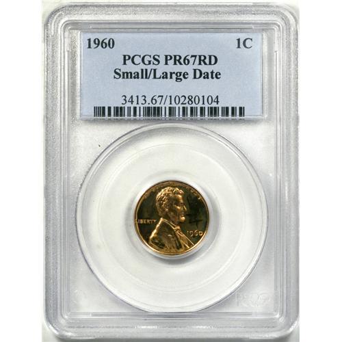 <B>1960 1C Small Over Large Date PR67 Red PCGS.</B></I> FS-024. One of three important proof varieties of the year, the other two are Large Over Small Date varieties. LIBERTY and the date exhibit characteristics of both hubs. A razor-sharp and beautifully preserved red-gold Superb Gem. Population: 28 in 67 Red, 7 finer (10/06).<BR><BR><b>Shipping:</b> Coin/Currency (<a target="_blank" href="http://www.heritageauctions.com/common/shipping.php">view shipping information</a>)