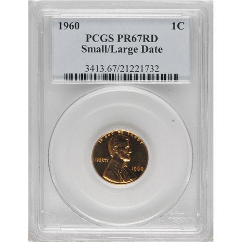 <B>1960 1C Small Over Large Date PR67 Red PCGS.</B></I> FS-024. The discovery of 1960 and 1960-D Small Date and Large Date business-strike Lincoln cents spurred a speculative mania in rolls that had never truly subsided since the low-mintage 1950-D nickels were coined. "Roll fever" was further fueled by the introduction of the dealer-to-dealer Teletype system. The speculative roll mania collapsed in 1965.<BR> Of course, the proof Lincoln cent varieties were much slower in gaining recognition, but today they are many, many times rarer. The Small Over Large Date proofs, like the two known Large Over Small Date proof obverses, were the result of dual-hub errors. The present Small Over Large Date is likely the rarest of the three proof varieties, according to <I>Cherrypickers'.</B></I> The surfaces are impeccable, with lush orange coloration over each side. Population: 34 in 67 Red, 9 finer (3/07).<BR><BR><b>Shipping:</b> Coins & Currency (<a target="_blank" href="http://www.heritageauctions.com/common/shipping.php">view shipping information</a>)