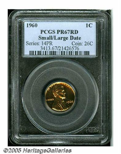<B>1960<1C> Small Over Large Date PR67 Red PCGS.</B></I> FS-024. One of three important proof varieties of the year, the other two are Large Over Small Date varieties. LIBERTY and the date exhibit characteristics of both hubs. A needle-sharp and gorgeously preserved apricot-gold Superb Gem.