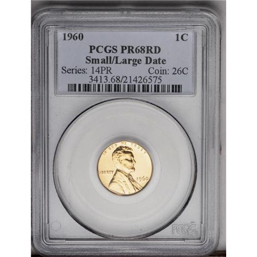 <B>1960<1C> Small Over Large Date PR68 Red PCGS.</B></I> FS-024. DDO-002. The Small over Large Date feature is obvious, when viewed with magnification. LIBERTY also exhibits doubling from the use of two different obverse hub types to create the working proof die. An outstanding pumpkin-gold Superb Gem. Population: 7 in 68, 0 finer (4/06).<BR><I>From The Empire Tree Collection.</B></I>
