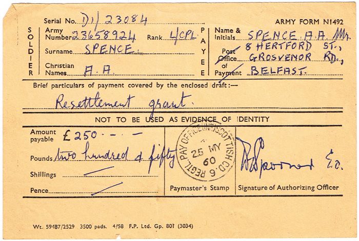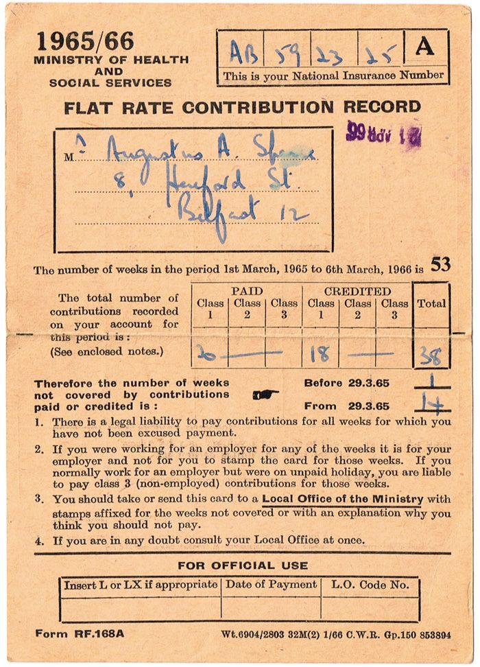 Collection of items relating to the life of 'Gusty' Spence including Union of Post Office Workers membership card, Transport and General Worker's Union card, army resettlement grant form, medical card, rent books, historical society membership cards, letter etc. Many items with Spence's signature. (16 items)