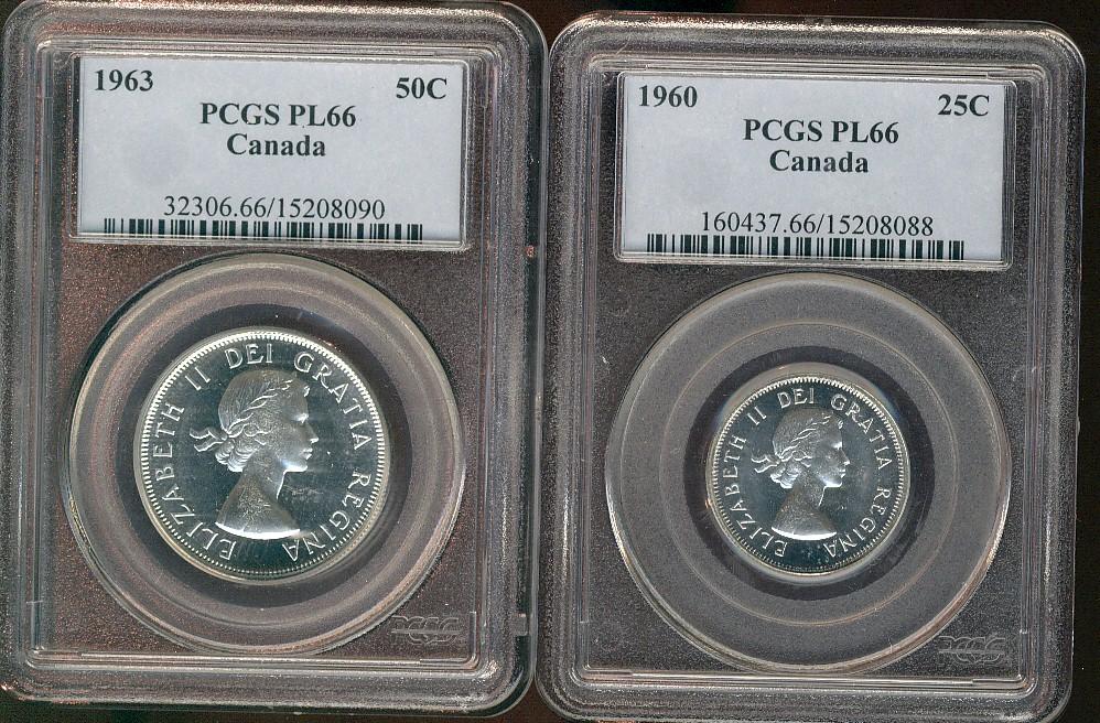 1960 25¢ & 1963 50¢. Lot of 2 coins both PCGS PL66.