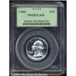 <B>1960<25C> PR69 Deep Cameo PCGS.</B></I> Tone-free, the mirrors are deep and black, contrasting the exceptionally frosted central devices. When inspected with a loupe, the coin is just as impressive with no contact marks or hairlines. The only factor seemingly keeping this piece from perfection is variations in the frosting intensity on obverse and reverse script. Population: 32 in 69, 0 finer (7/04). <BR><BR><B>Important notice:</B> Heritage usually auctions material at the rate of 200-250 lots per hour. On some occasions eBay Live bid software or the Internet may not be able to keep up with the pace of the auction. We recommend placing a realistic absentee bid now as insurance to avoid disappointment. Occasionally the auctioneer may eliminate or reject an eBay Live bid, and the auctioneer may also reopen a lot after the close of the eBay live bidding (usually because we missed an audience bid), and may reject your bid even if it shows you as the winning bidder. By bidding via eBay Live, you agree that Heritage may award the lot to another bidder at its sole discretion under the circumstances described above or any other reasonable circumstances. Since eBay bids are not shown to us until we open the lot on the floor, we treat those bids just like floor bids. In most cases the floor responds before the eBay bid is presented to us, due to Internet lag time, so for consistency we have made it a policy that floor bids are always considered first over tie eBay live bids. Also please note that all Heritage lots purchased through eBay Live carry a 20% Buyer's Premium. Please make sure you read the Terms and Conditions before you bid. </span></font></tr></table></td></tr></table>