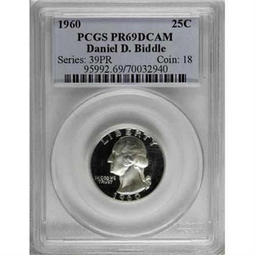 <B>1960 25C PR69 Deep Cameo PCGS.</B></I> Ex: Daniel D. Biddle Collection. With spectacular jet-black fields and heavily frosted devices, the Deep Cameo effect is truly remarkable. A virtually flawless proof Washington quarter. Population: 32 in 69 Deep Cameo, 0 finer (8/07). <BR><BR><b>Shipping:</b> Coins & Currency (<a target="_blank" href="http://www.heritageauctions.com/common/shipping.php">view shipping information</a>)