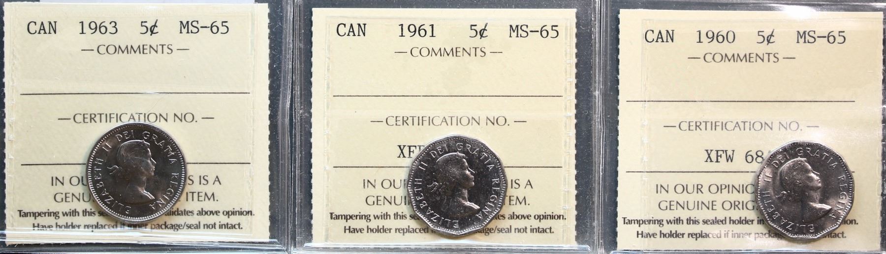 1960 5¢, 1961, and 1963 all ICCS Gem Mint State-65, lot of 3 coins.