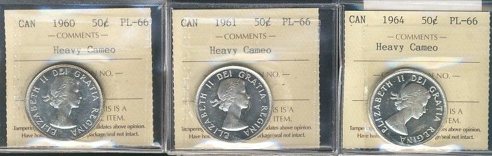 1960 50¢, 1961 & 1964 ICCS PL66 Heavy Cameo. Lot of 3 coins.