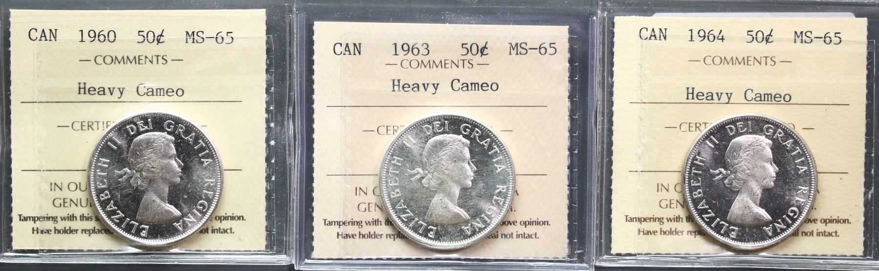 1960 50¢, 1963, and 1964, all ICCS Gem Mint State-65 Heavy Cameo.