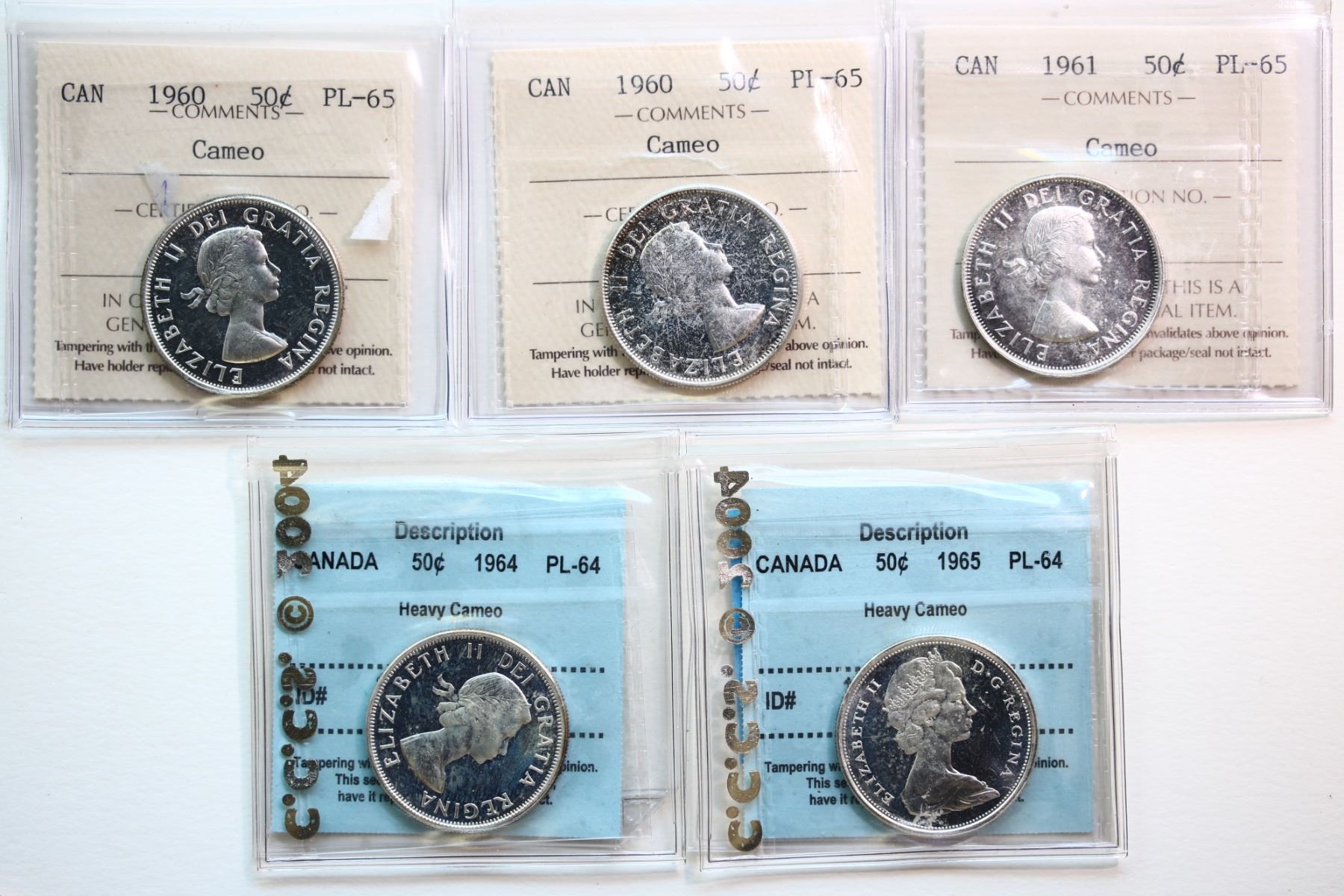 1960 50¢ (2), 1961, 1964, 1965. Lot of 5 coins ICCS Choice Proof-Like-64 to Gem Proof-Like-65, all Cameo to Heavy Cameo