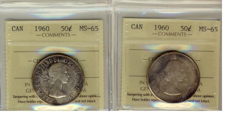 1960 50¢ ICCS MS65. Lot of 2 coins both with pristine tones.