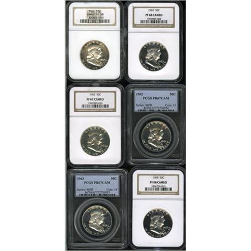 <B>1960 50C PR68 Cameo NGC; 1962 PR67 Cameo PCGS; 1962 PR67 Cameo NGC; 1962 PR68 Cameo NGC; 1963 PR67 Cameo PCGS</B></I> and a <B>1963 PR68 Cameo NGC.</B></I><BR><BR><b>Shipping:</b> Coin/Currency (<a target="_blank" href="http://www.heritageauctions.com/common/shipping.php">view shipping information</a>\)