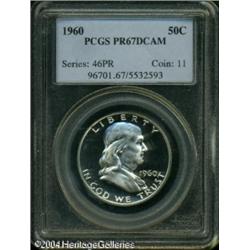 1960 50C PR67 Deep Cameo PCGS. Fully struck with m <B>1960 50C PR67 Deep Cameo PCGS.</B></I> Fully struck with majestic contrast displayed between frosted devices and deep pools of mirrored reflectivity in the inky-black fields. There is a wispy, barely visible pinscratch on the lower left bell lines. Population: 99 in 67, 77 finer (11/04). <BR><BR><B>Important notice:</B> Heritage usually auctions material at the rate of 200-250 lots per hour. On some occasions eBay Live bid software or the Internet may not be able to keep up with the pace of the auction. We recommend placing a realistic absentee bid now as insurance to avoid disappointment. Occasionally the auctioneer may eliminate or reject an eBay Live bid, and the auctioneer may also reopen a lot after the close of the eBay live bidding (usually because we missed an audience bid), and may reject your bid even if it shows you as the winning bidder. By bidding via eBay Live, you agree that Heritage may award the lot to another bidder at its sole discretion under the circumstances described above or any other reasonable circumstances. Since eBay bids are not shown to us until we open the lot on the floor, we treat those bids just like floor bids. In most cases the floor responds before the eBay bid is presented to us, due to Internet lag time, so for consistency we have made it a policy that floor bids are always considered first over tie eBay live bids. Also please note that all Heritage lots purchased through eBay Live carry a 20% Buyer's Premium. Please make sure you read the Terms and Conditions before you bid. This lot is being auctioned in conjunction with a live floor auction by Heritage Galleries & Auctioneers. All final auction and invoice information will be supplied by Heritage Galleries & Auctioneers, and all other information should be considered preliminary. Lot:6335