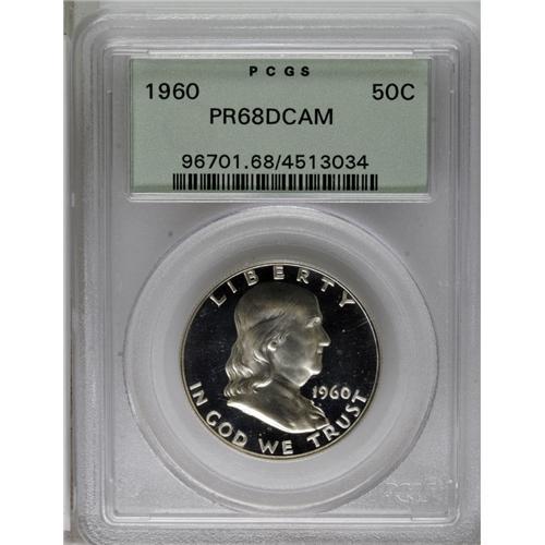 <B>1960 50C PR68 Deep Cameo PCGS.</B></I> Strongly contrasted with fathomless mirrors and a hint of gold on the frosted devices. A small milk spot is noted in the right obverse field. PCGS has graded only five finer Deep Cameo pieces (2/07).<BR><BR><b>Shipping:</b> Coins & Currency (<a target="_blank" href="http://www.heritageauctions.com/common/shipping.php">view shipping information</a>)