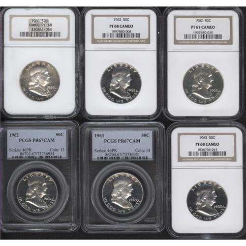 <B>1960 50C PR68 Cameo NGC; 1962 PR67 Cameo PCGS; 1962 PR67 Cameo NGC; 1962 PR68 Cameo NGC; 1963 PR67 Cameo PCGS</B></I> and a <B>1963 PR68 Cameo NGC.</B></I><BR><BR><b>Shipping:</b> Coin/Currency (<a target="_blank" href="http://www.heritageauctions.com/common/shipping.php">view shipping information</a>)