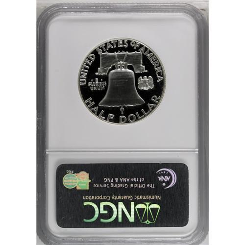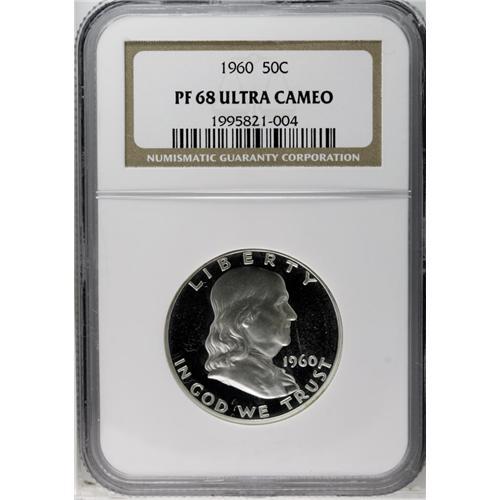 <B>1960<50C> PR68 Ultra Cameo NGC.</B></I> A gorgeous black-and-white coin with exceptionally heavy cameo contrast, struck from matched dies with deep, watery fields and thickly frosted devices. Census: 59 in 68, 1 finer (6/06).
