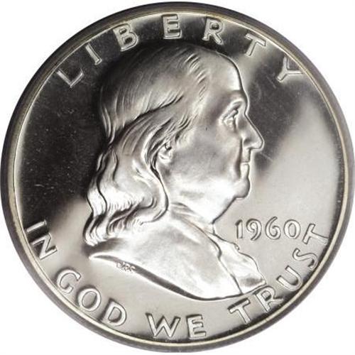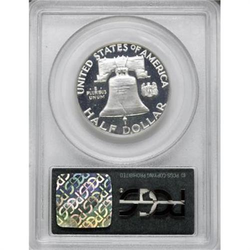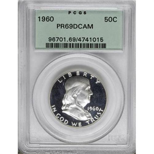 <B>1960 50C PR69 Deep Cameo PCGS.</B></I> Collectors of proof Franklin half dollars are aware of the scarcity of examples that display significant cameo contrast. Unlike modern Mint proofs, their counterparts from the 1950s and 1960s rarely possess frosted devices. Generally, only the initial strikes from a new pair of proof dies exhibited contrast. The significance of this characteristic was lost on most collectors of the day, and most Deep Cameo survivors display a few hairlines from brief mishandling or improper storage. But the present specimen combines remarkable preservation with elusive pronounced two-sided white-on-black contrast. Brilliant save for traces of gold patina, and certified in a green label holder. Population: 5 in 69 Deep Cameo, 0 finer (10/07).<BR><I>From The Kallenberg #1 PCGS Registry Set Of Proof Half Dollars.</B></I><BR><BR><b>Shipping:</b> Coins & Currency (<a target="_blank" href="http://www.heritageauctions.com/common/shipping.php">view shipping information</a>)