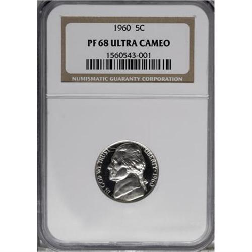 <B>1960 5C PR68 Deep Cameo NGC.</B></I> NGC Census: (15/5). PCGS Population (45/4). Numismedia Wsl. Price for NGC/PCGS coin in PR68: $360. (#94192)<BR><BR><b>Shipping:</b> Coins & Currency (<a target="_blank" href="http://www.heritageauctions.com/common/shipping.php">view shipping information</a>)