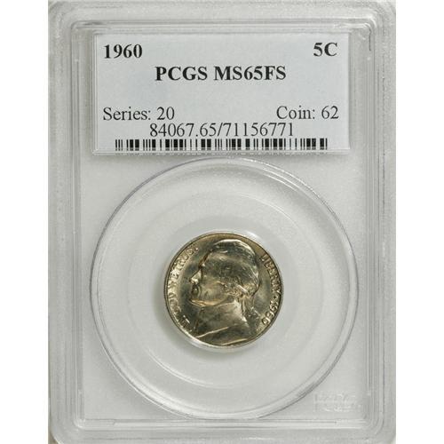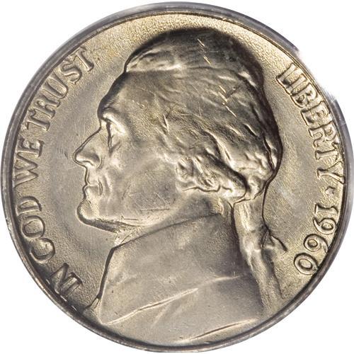 <B>1960 5C MS65 Full Steps PCGS.</B></I> Many of the recent Jefferson nickel issues, from the past half century, are extremely rare with full steps on the reverse. This example just misses six steps and is one of the best certified by PCGS. In fact, only one finer piece has been certified by this firm, carrying a grade of MS66 Full Steps. Population: 7 in 65, 1 finer (3/07).<BR><BR><b>Shipping:</b> Coins & Currency (<a target="_blank" href="http://www.heritageauctions.com/common/shipping.php">view shipping information</a>)
