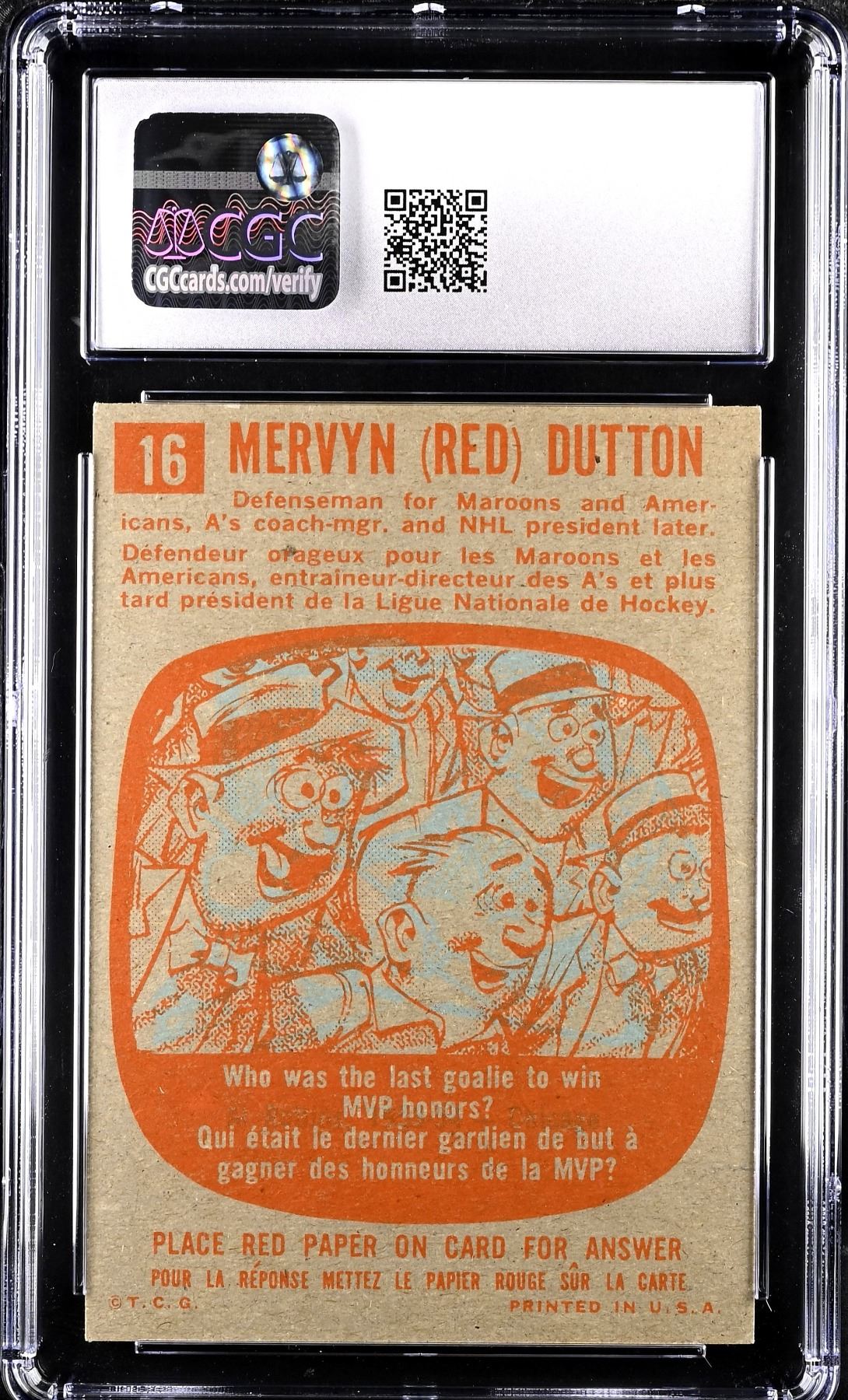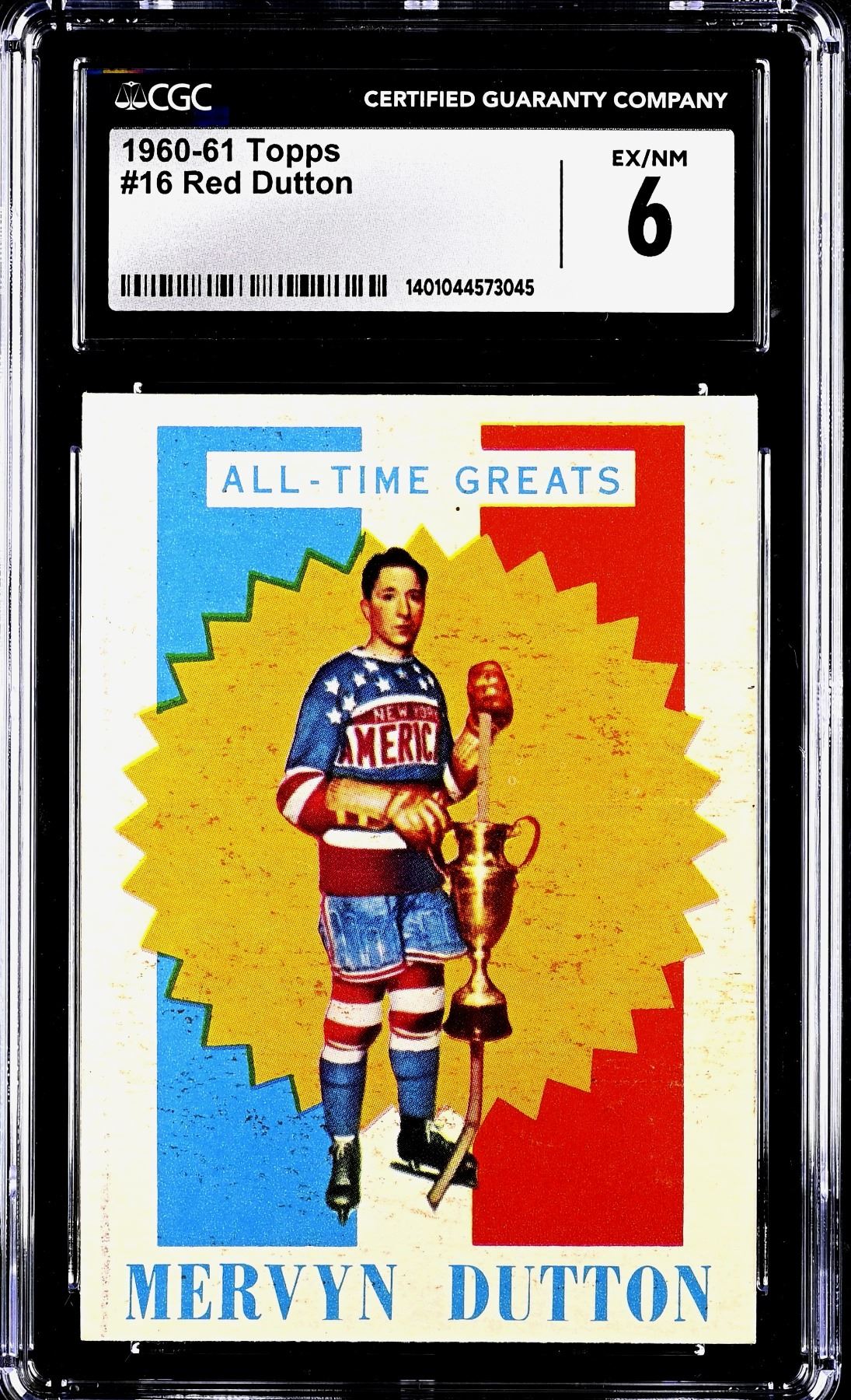 'All-Time Great' and Hall of Famer, Red Dutton, was a tough defenseman in the 1920s and 30s who lead the NHL in penalty minutes twice. He was a playing coach, a coach, an executive, worked for the Hall of Fame, was involved with the Calgary Stampeders of the CFL, among many business interests. Graded a solid 6 EX-NM by CGC.