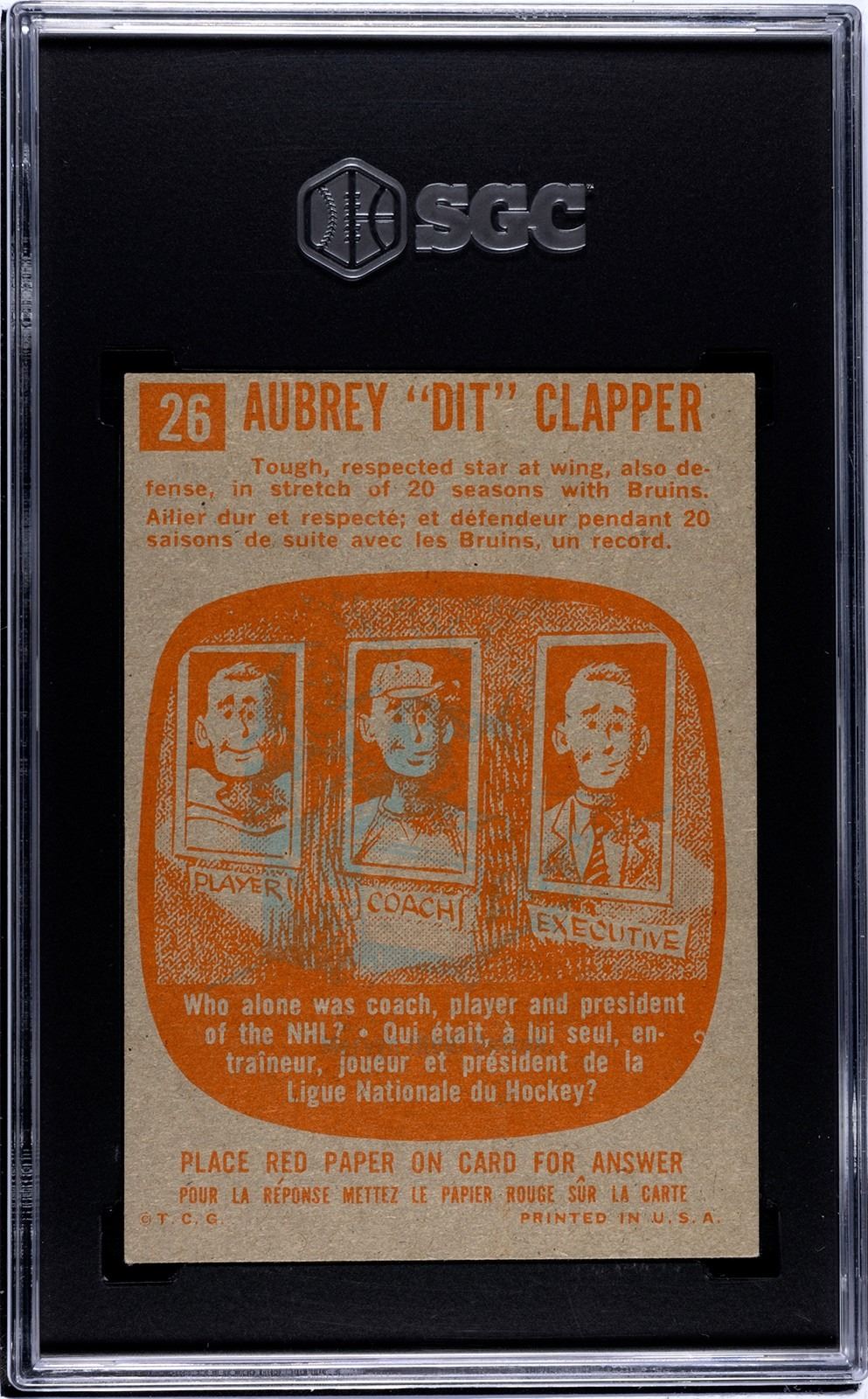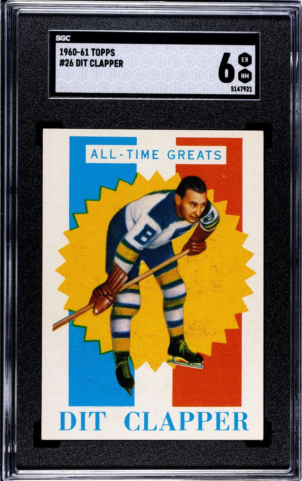 HOFer Clapper played his entire 20-year NHL career with Boston, and became the first living inductee in the Hall of Fame (prior to Clapper all others were inducted posthumously). He played both forward and defense, was elected to all-star teams at both positions, and won three Stanley Cups. Graded a superb 6 EX-NM by SGC.