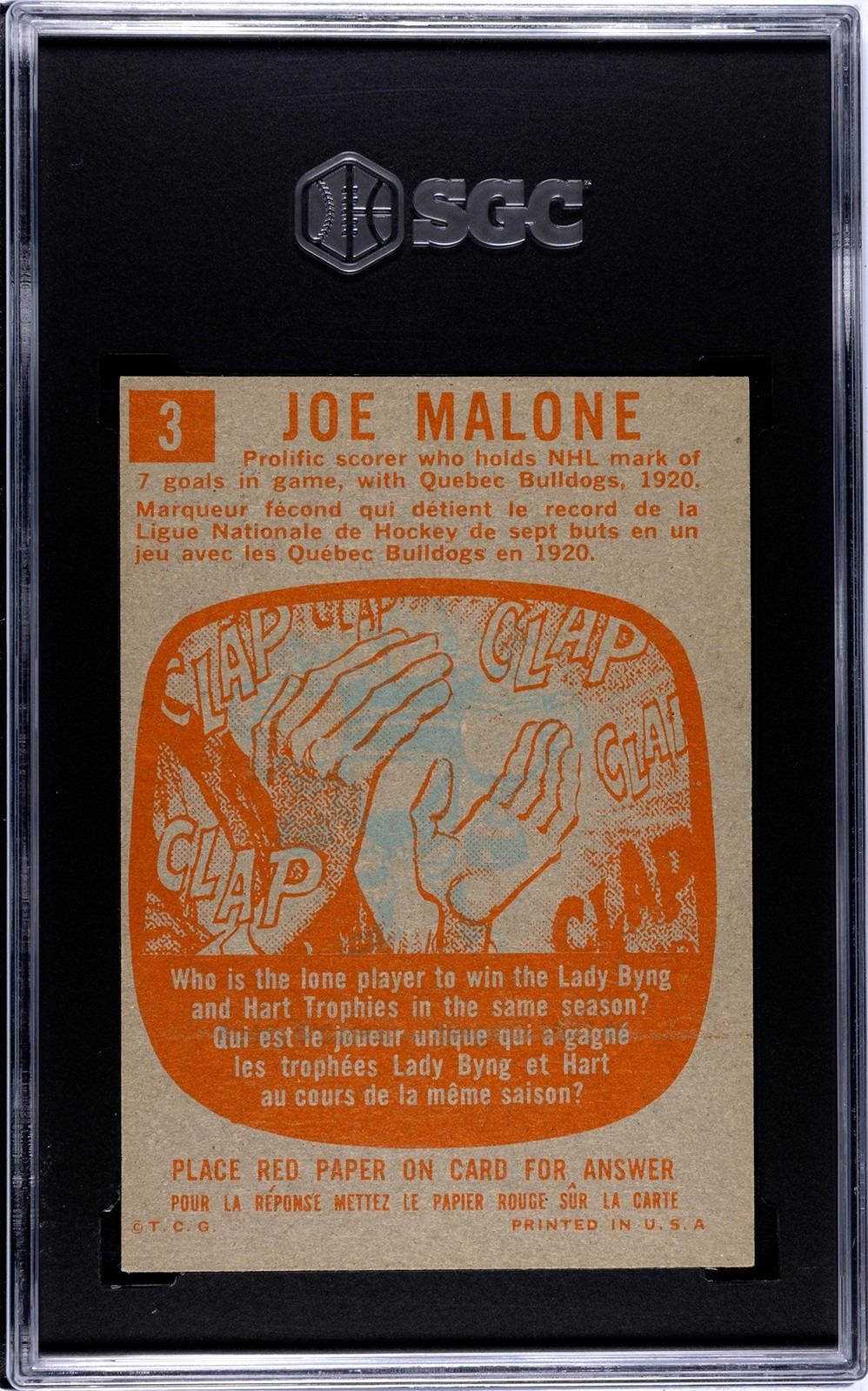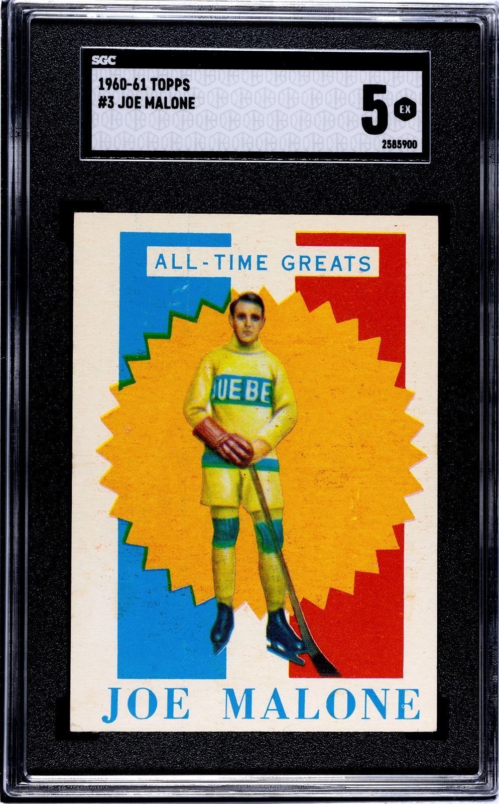 Similar to the 1955 Parkhurst set, the 1960 Topps offering included a subset of "All-Time Greats" from hockey's past. It was a creative way to fill out the set as Topps did not have the rights to the most star filled teams, Detroit, Toronto and Montreal, which were to be found in that seasons Parkhurst issue. Hall of Famer "Phantom" Joe Malone was a prolific goal scorer in the earliest days of the NHL. In 1913-14, with Quebec of the NHA (main pre-cursor of the NHL) he scored 43 times in only 20 games. In 1916-17, again with Quebec, he'd light the lamp 41 times in 19 contests. The following season, as a member of the Montreal Canadiens for the inaugural NHL campaign, he would score an incredible 44 times in only 20 games (also leading the league in scoring). He would lead the NHL again in 1920 with 39 goals and 49 points in 24 games. He won a pair of Stanley Cups and is one of the game's most legendary performers. This All-Time Great is freshly graded 5 EX by SGC.