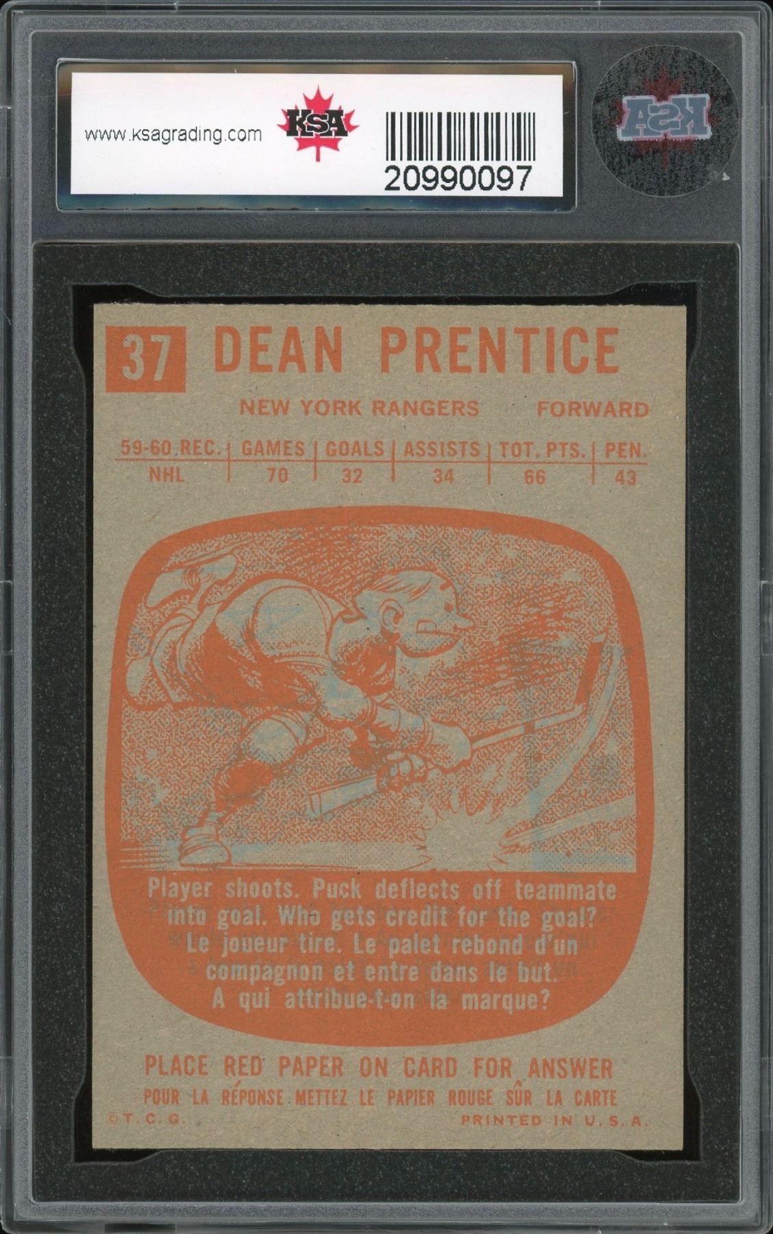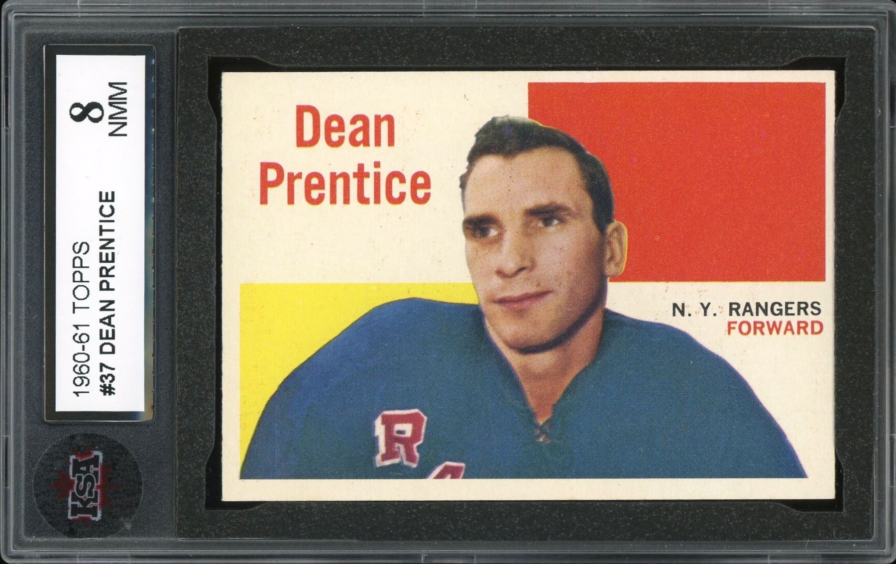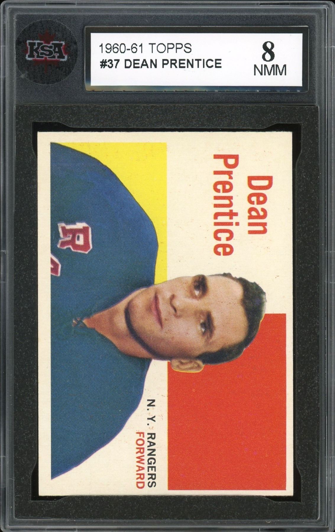 Super nice example of Prentice's 1960 Topps card. Dean played 22 years, alnost 1,4000 games, and scored 391 goals. He was durable and actually scored a penalty shot goal with a broken back sustained on the play. After his playing days he spent time coaching in various leagues. Graded 8 NM-MT by KSA!