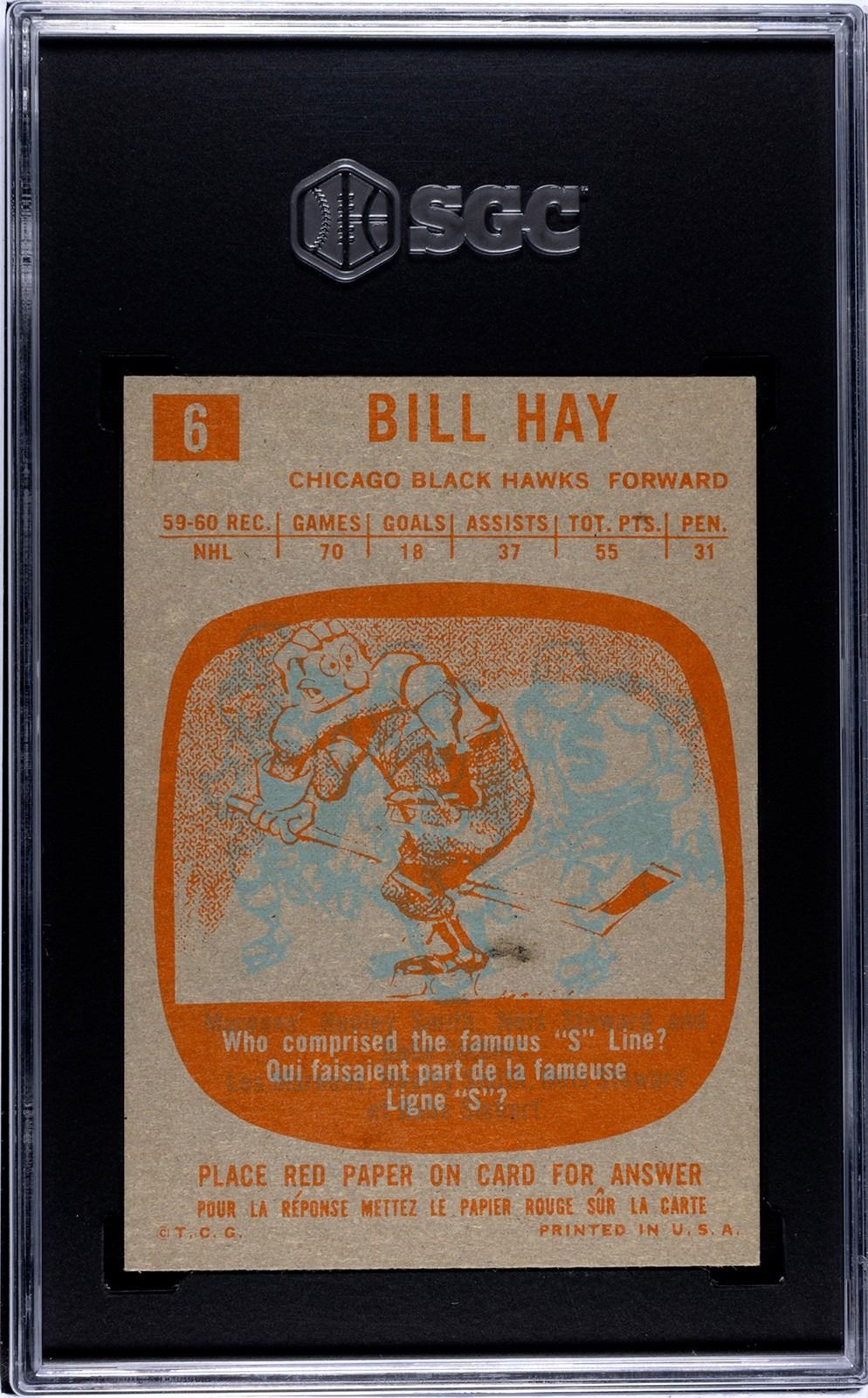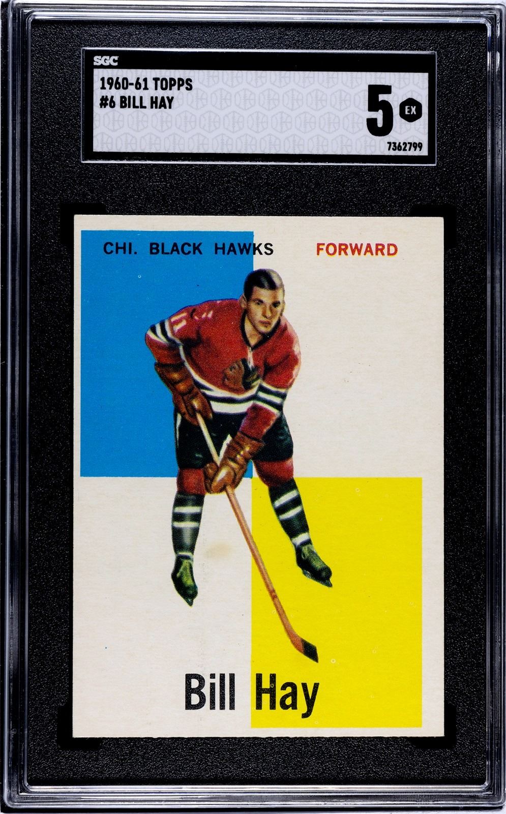 HOFer Bill Hay was Rookie of the Year in 1960 and won a Stanley Cup with Chicago. He went on to become President of the Calgary Flames and Chairman of the Hockey Hall of Fame. Graded 5 EX by SGC.