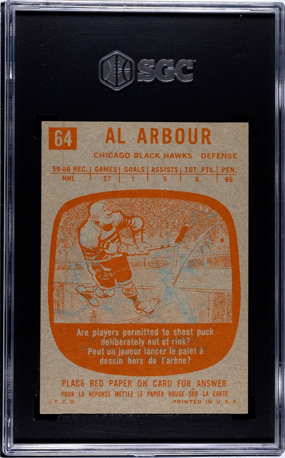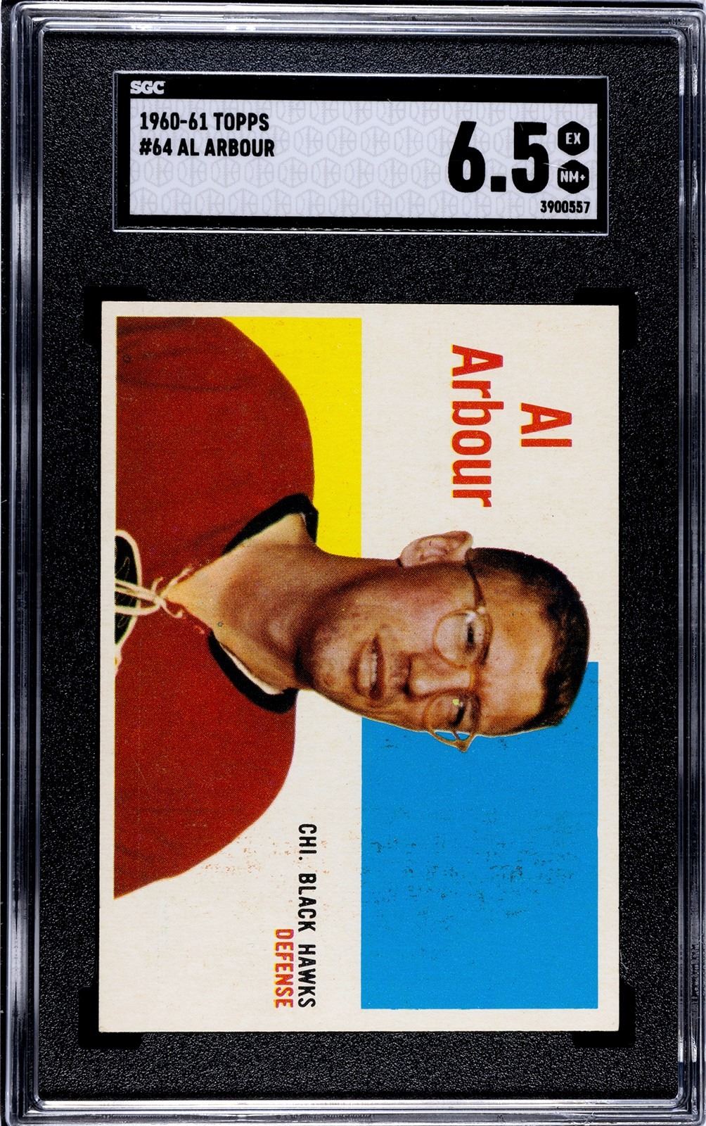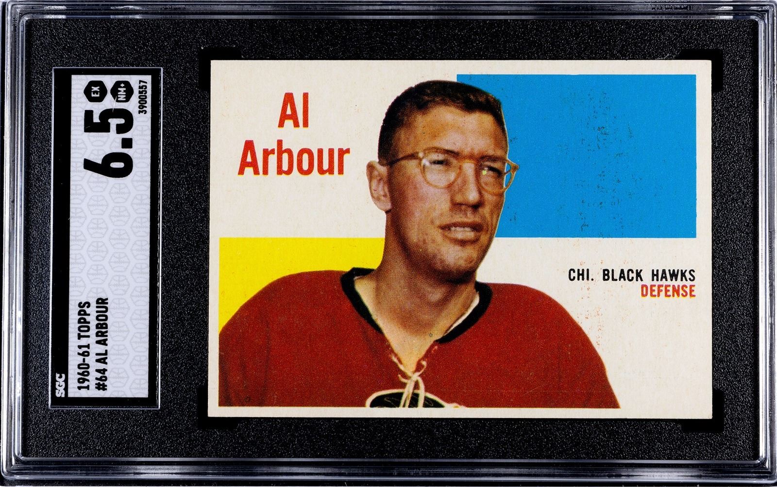 Gorgeous example of this HOFer's colorful 1960 Topps offering. Arbour had a solid NHL career, playing 626 games over 14 seasons where he would win three Stanley Cups. He also won an AHL Calder Cup in 1965. Arbour was able to take what he learned as a player on those championship teams to become one of the NHL's most successful coaches. He spent 23 years behind the bench, winning 782 games and guiding the New York Islanders to four consecutive Stanley Cup titles. Graded a super clean 6.5 EX-NM+ by SGC.