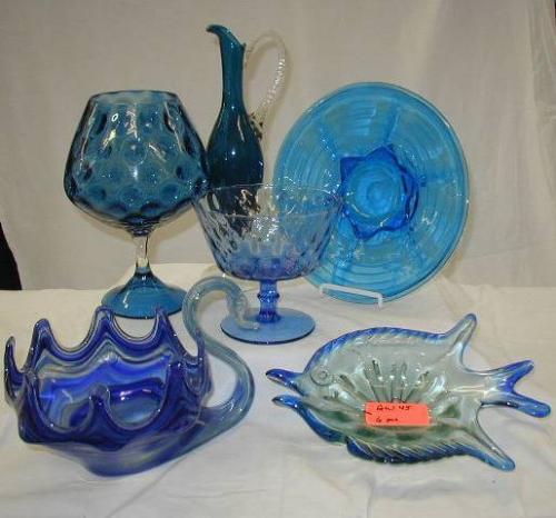 1960 ART GLASS LOT INCLUDES FISH BOWL, SWAN DISH, CENTER BOWL (CHIPS IN APPLIED GLASS RIM),1960 LARGE FOOTED BOWL, FOOTED PITCHER, 5 PCS.