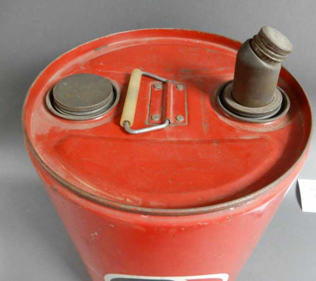1960 B/A 5 IMP. GAL. FUEL CAN EMBOSSED BOTTOM- CORRECT CAPS- DENTING & SCRATCHING LOCATION: LOWER BACKROOM