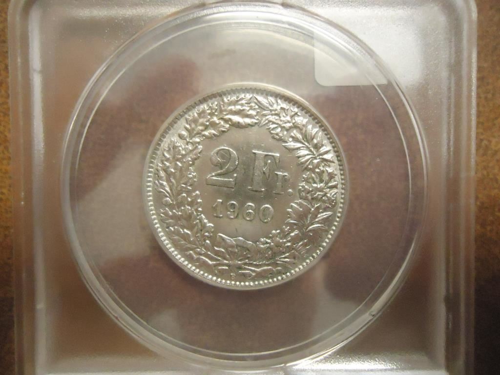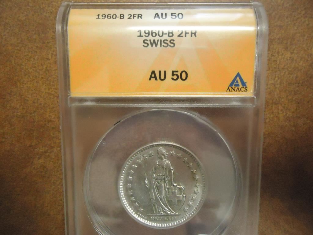 1960-B SWISS SILVER 2 FRANC ANACS AU50