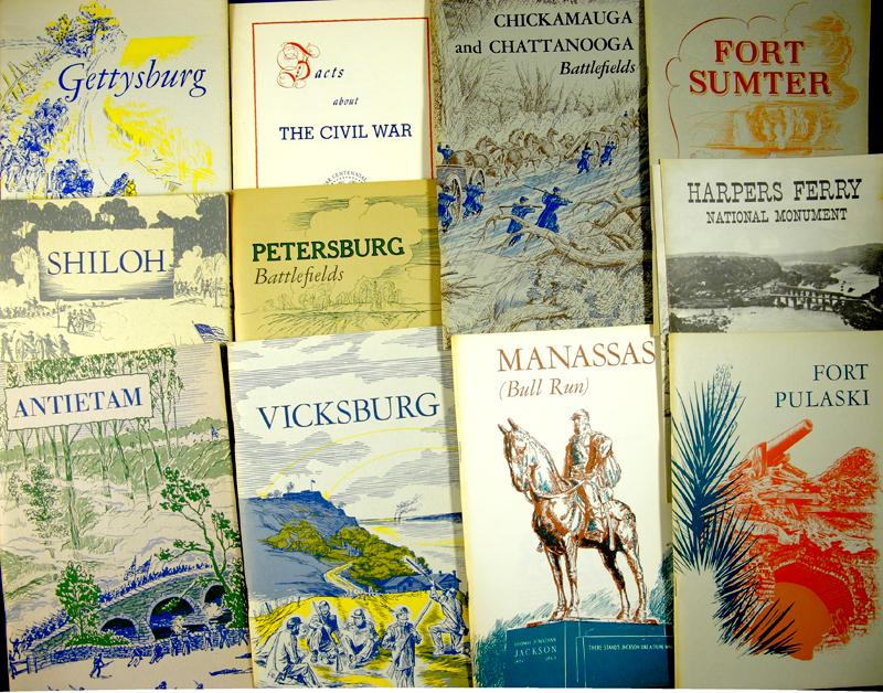 Lot of 9 booklets from 1960 dedicated to commemorating the centennial of the Civil War and its infamous places and battles. All booklets have facts and information on famous places and battles from the Civil War. There are books covering these places: Gettysburg, Harpers Ferry, Fort Pulaski, Fort Sumter, Manassas (Bull Run) Chickamauga and Chattanooga Battlefields, Vicksburg, Petersburg Battlefields, Antietam and Shiloh. All were produced by the Civil War Centennial Commission.