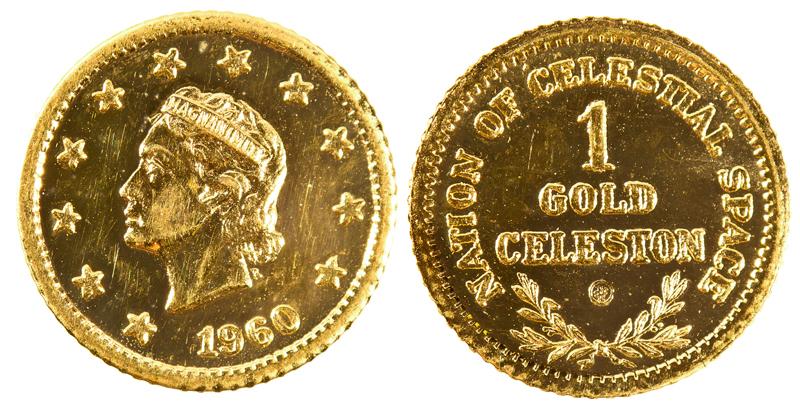 Souvenir token. $1 gold. Obverse, dated 1960 liberty head surrounded by eleven stars. Reverse, nation of celestial space 1 gold Celestin 900 fine gold reeded edge. Mintage 200.
