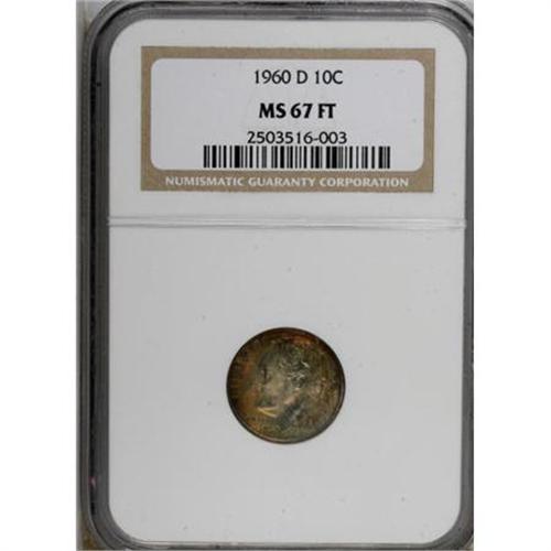<B>1960-D 10C MS67 Full Bands NGC.</B></I> NGC Census: (0/0). PCGS Population (7/0). Mintage: 200,160,400. (#85121)<BR><BR><B>Coin Engraver:</B> John R. Sinnock<BR><BR><b>Shipping:</b> Coins & Currency (<a target="_blank" href="http://www.heritageauctions.com/common/shipping.php">view shipping information</a>)
