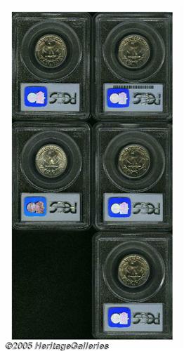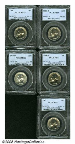 <B>1960-D<25C> MS66 PCGS,</B></I> peripheral gold color, clean aside from a tick on the left leg; <B>1966 MS67 PCGS,</B></I> tan patina, well preserved, a reasonable strike; <B>1967 MS67 PCGS,</B></I> golden-brown hues, some striking weakness along the border; <B>1968-D MS67 PCGS,</B></I> beautifully preserved, bold, an orange-peel texture; and a <B>1969-D MS67 PCGS,</B></I> blushes of gold color on the portrait, nearly pristine.<BR><I>From The Gary Kramer Collection of Washington Quarters.</B></I>