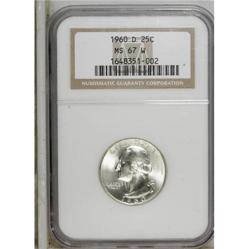 <B>1960-D 25C MS67 W NGC.</B></I> This essentially brilliant Superb Gem features dazzling luster and exquisite preservation. A full strike further enhances the eye appeal. The left branch of the wreath is bright, as ejected from the reverse die. Census: 11 in 67, 0 finer (1/07).<BR><BR><b>Shipping:</b> Coins & Currency (<a target="_blank" href="http://www.heritageauctions.com/common/shipping.php">view shipping information</a>)