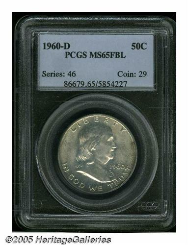 <B>1960-D<50C> MS65 Full Bell Lines PCGS.</B></I> Well preserved with a flashy mint bloom and relatively few marks for the grade. One of the more difficult issues to find with Full Bell Lines.