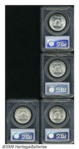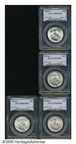 <B>1960-D<50C> MS65 Full Bell Lines PCGS,</B></I> lustrous, with some faint color and just the faintest contact marks; <B>1961-D MS65 Full Bell Lines PCGS,</B></I> lustrous light green-gold color, a small tick is noted below the makers mark of the bell; <B>1962-D MS65 Full Bell Lines PCGS,</B></I> highly lustrous, a few spots of watery-red color and just a few tiny marks, including one in the field to the right of Franklin's mouth, and a <B>1963-D MS65 Full Bell Lines PCGS,</B></I> vaguely matte example with light sand tonality and only some very tiny luster marks.<BR><I>From The Southern Collection.</B></I>