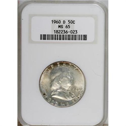 <B>1960-D 50C MS65 NGC.</B></I> NGC Census: (467/9). PCGS Population (145/3). Mintage: 18,215,812. Numismedia Wsl. Price for NGC/PCGS coin in MS65: $240. (#6679)<BR><BR><B>Coin Engraver:</B> John R. Sinnock<BR><BR><b>Shipping:</b> Coins & Currency (<a target="_blank" href="http://www.heritageauctions.com/common/shipping.php">view shipping information</a>)