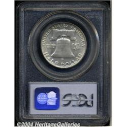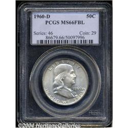 <B>1960-D<50C> MS66 FBL PCGS.</B></I> Frosty silver surfaces exhibit exceptional luster and accent the extremely sharp design features of this important Gem quality Franklin half dollar. This is an extremely unusual opportunity for the advanced specialist, and is actually one of the finest 1960-D half dollars in existence. This date is normally encountered with heavily bagmarked surfaces. Author Rick Tamaska needed just one sentence to sum up this issue in high grades: "Superb specimens command huge premiums commensurate with their status within the series." Population: 9 in 66, 0 finer (3/04). <BR><BR><B>Important notice:</B> Heritage usually auctions material at the rate of 200-250 lots per hour. On some occasions eBay Live bid software or the Internet may not be able to keep up with the pace of the auction. We recommend placing a realistic absentee bid now as insurance to avoid disappointment. Occasionally the auctioneer may eliminate or reject an eBay Live bid, and the auctioneer may also reopen a lot after the close of the eBay live bidding (usually because we missed an audience bid), and may reject your bid even if it shows you as the winning bidder. By bidding via eBay Live, you agree that Heritage may award the lot to another bidder at its sole discretion under the circumstances described above or any other reasonable circumstances. Since eBay bids are not shown to us until we open the lot on the floor, we treat those bids just like floor bids. In most cases the floor responds before the eBay bid is presented to us, due to Internet lag time, so for consistency we have made it a policy that floor bids are always considered first over tie eBay live bids. Also please note that all Heritage lots purchased through eBay Live carry a 20% Buyer's Premium. Please make sure you read the Terms and Conditions before you bid. </span></font></tr></table></td></tr></table>