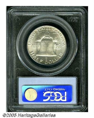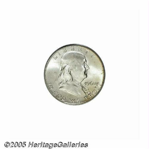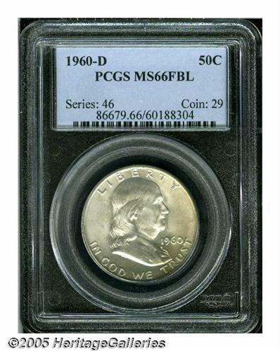 <B>1960-D<50C> MS66 Full Bell Lines PCGS.</B></I> Mostly brilliant with creamy smooth, satiny fields and subtly frosted central devices that have escaped all but the most trivial signs of contact. The lowly 1960-D Franklin has proven to be one of the more challenging issues in the entire series in well struck Premium Gem condition. Population: 13 in 66, 0 finer (6/05).